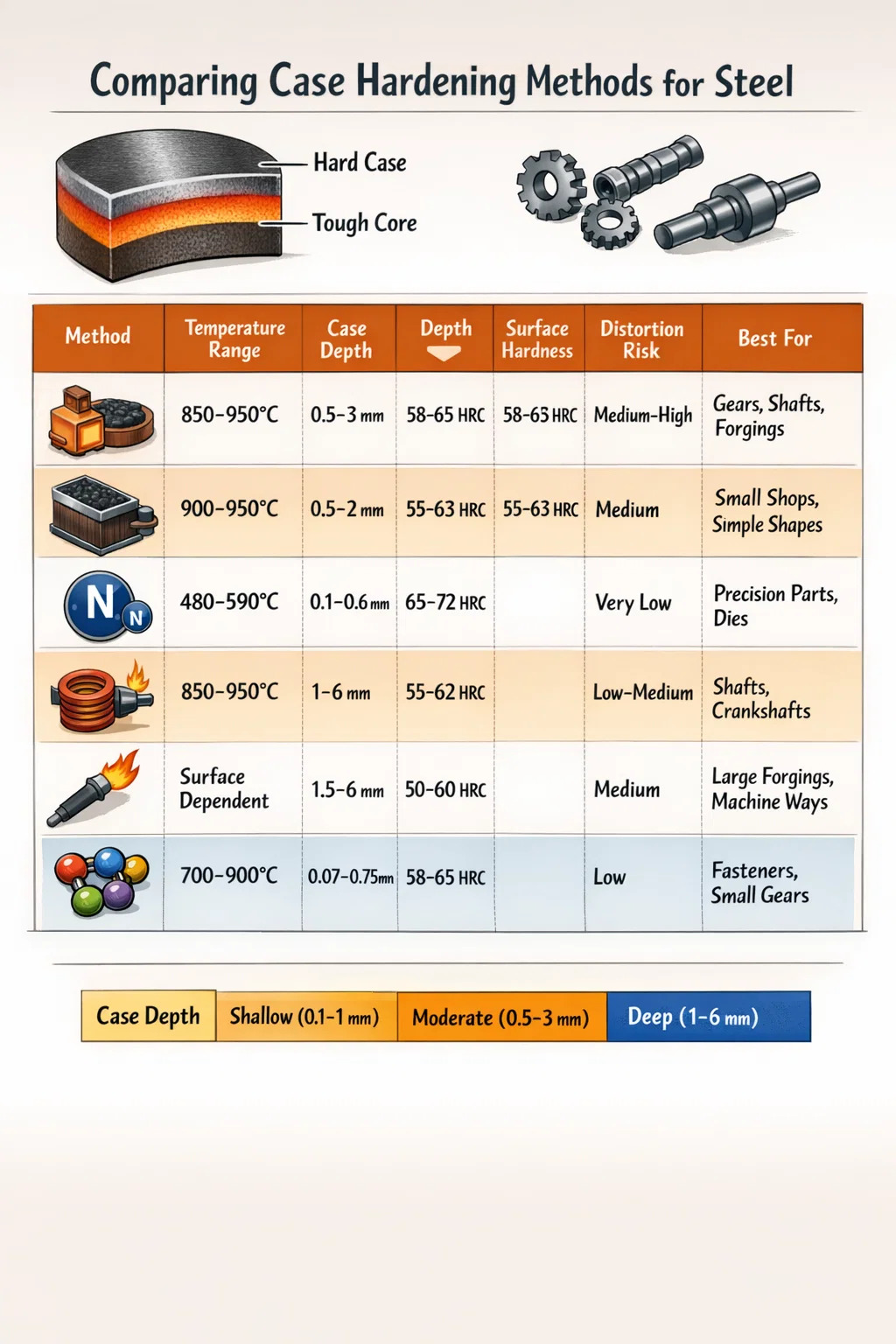 چندین روش ثابت برای سخت شدن فولاد وجود دارد که هر کدام برای مواد مختلف، نیازهای عمق کیس و محیط های تولید مناسب است. انتخاب مناسب به آلیاژ فولاد پایه، سختی سطح مورد نظر، تحمل ابعادی و تجهیزات موجود بستگی دارد.