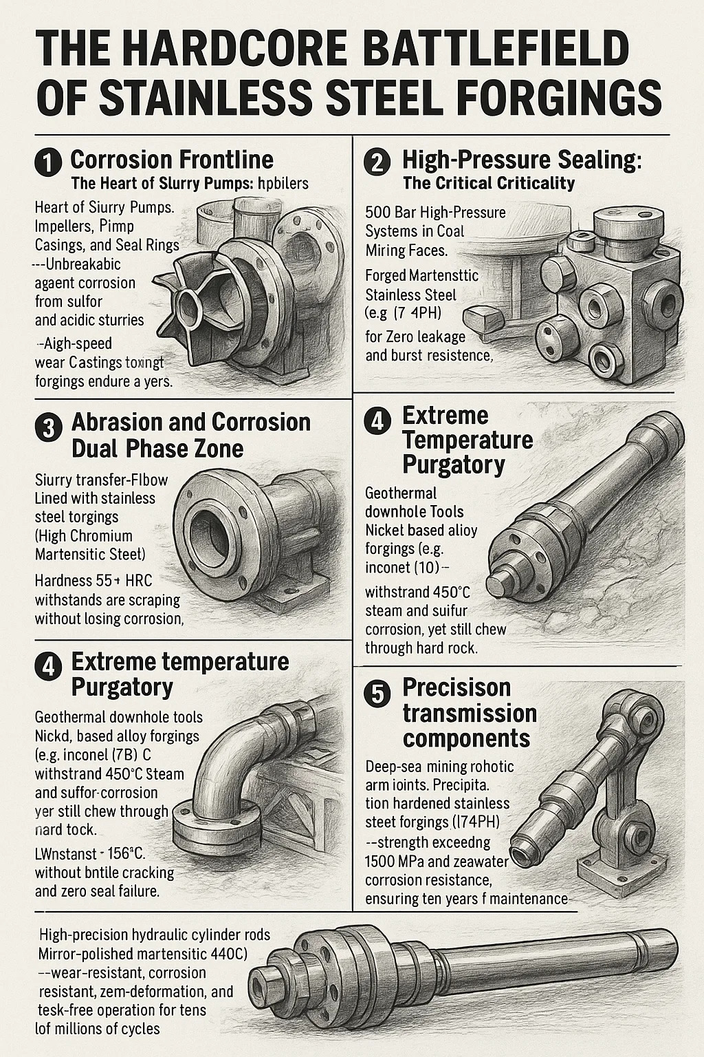 قلب پمپ های دوغاب: پروانه ها ، پمپ های پمپ و حلقه های مهر و موم- غیرقابل شکست در برابر خوردگی از دوغاب سولفور و اسیدی و سایش پر سرعت. ریخته گری ها در شش ماه از بین می روند ، در حالی که فرجوها سه سال تحمل می کنند.