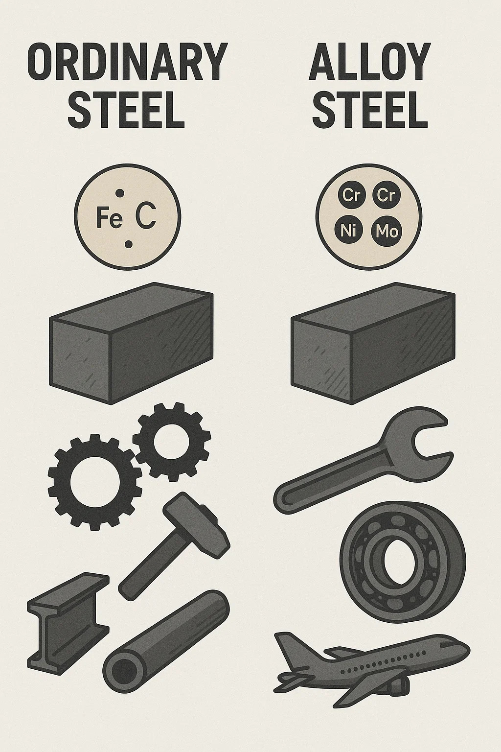 | ترکیب اولیه | کربن آهن (با کمترین ناخالصی) | کربن آهن عناصر آلیاژی اضافه شده قابل توجه (مانند کروم، نیکل، مولیبدن) |